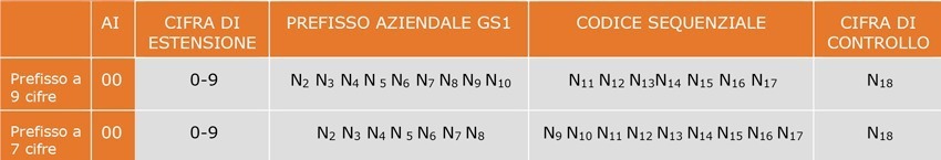 Il codice SSCC è un GS1-128, che utilizza l’AI 00. Analizzando la sua struttura si scopre che l'etichetta è suddivisa in due parti principali: